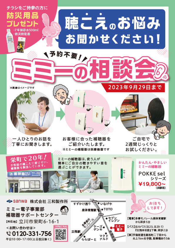 2023年9月1日(金)〜29日(金)まで、ミミー電子事業部補聴器サポートセンター(東京都立川市栄町6-16-1、営業時間:10:00~17:00、定休日:土・日)にてミミーの相談会を実施いたします。ぜひ、お気軽にお越しください。